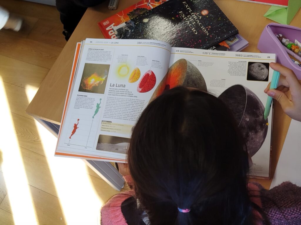 Comenzamos con una introducción sobre la Luna, en la que hablamos de sus fases, su superficie, los eclipses y las misiones que han permitido conocerla mejor. Después, llegó el turno de investigar: propusimos a los alumnos y alumnas un reto en grupos para buscar curiosidades sobre nuestro satélite en los libros y preparar una cartulina con los resultados para compartirlos con el resto de compañeros. Se formaron seis equipos que se organizaron con entusiasmo, demostrando una gran capacidad de trabajo en grupo, creatividad y espíritu científico.