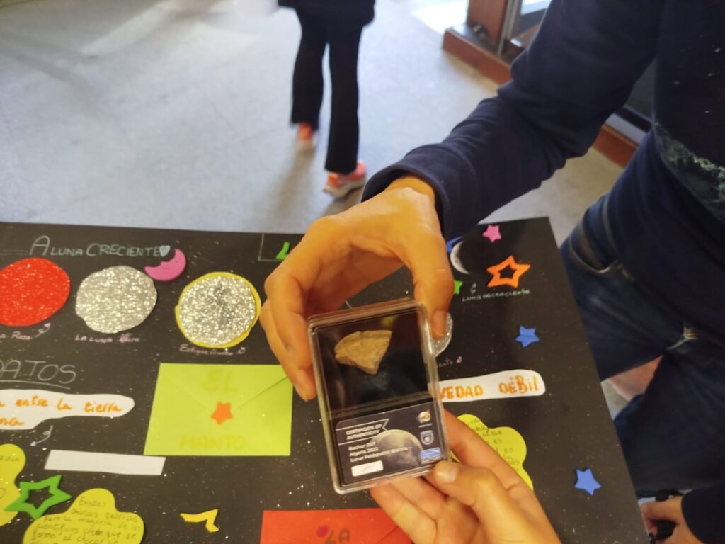 Para enriquecer la experiencia, llevamos materiales astronómicos relacionados con la Luna, que los participantes pudieron observar y manipular durante el taller. Y al final de la sesión llegó la gran sorpresa: ¡un auténtico trozo de Luna! 🌕 Se trataba de un fragmento de meteorito lunar, una roca que en su día impactó en nuestro satélite y viajó hasta la Tierra. Poder verla tan de cerca causó asombro y emoción entre todos los asistentes.